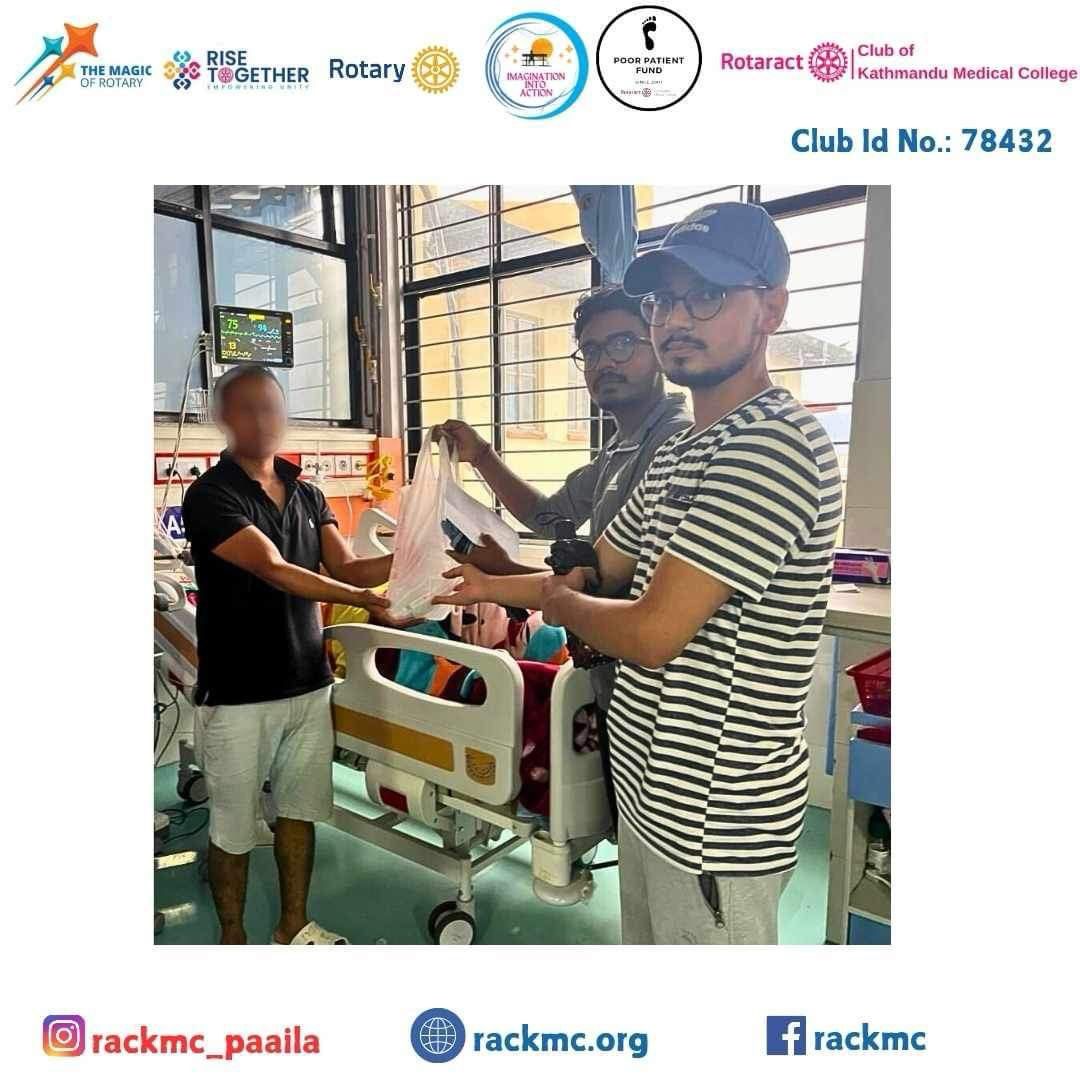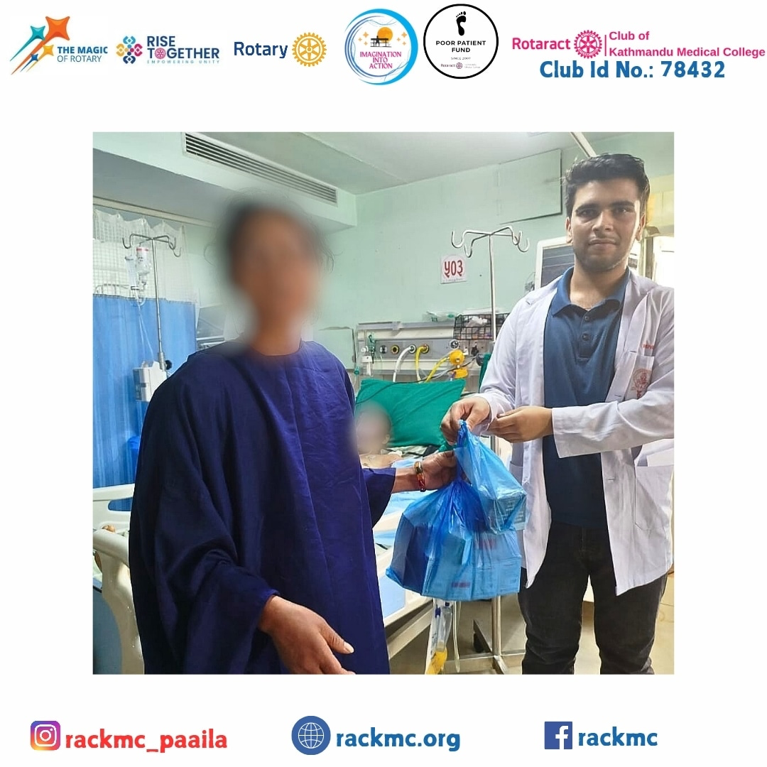 The Poor Patient Fund (PPF), introduced 17 years ago by the Rotaract Club of Kathmandu Medical College (KMC), is a compassionate initiative aimed at supporting underprivileged patients. This program provides essential food and medications to those in need, ensuring that lack of resources does not hinder access to necessary medical care. By alleviating the financial burden on patients, the Poor Patient Fund contributes significantly to the health and well-being of the community, embodying the spirit of service and humanity.